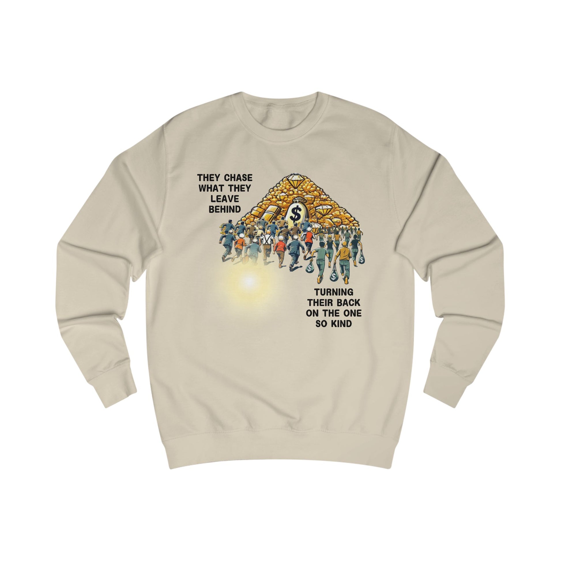 This design captures the eternal struggle of humanity—chasing after fleeting wealth and possessions while turning away from the eternal light of the Divine. Inspired by the timeless wisdom of Gurbani: "They struggle for what they must eventually leave. They turn away from the Lord, their Help and Support, who is always with them." The crowd runs toward piles of gold, symbolising worldly desires, while the radiant light behind them represents the ever-present grace of the Divine. A powerful reminder to reflect on what truly matters and to turn toward the eternal, not the temporary.